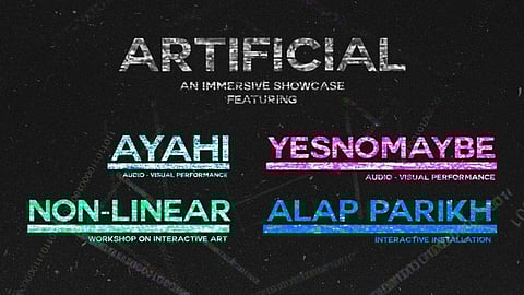 The showcase begins with Interactive Art Unplugged, a seminar-style workshop for curious minds, offering an introduction to the tools, technologies, and techniques behind developing interactive art installations. The session requires no prior experience or technical skills. The workshop will be led by Dennis Peter, the creative mind behind Non-linear — an art practice dedicated to crafting interactive and immersive installations that blend sound, lighting, visuals, and mechanics. The workshop will be followed by the performance pieces 'HYPERREAL' by Ayahi and 'Digital Existentialism' by YESNOMAYBE.