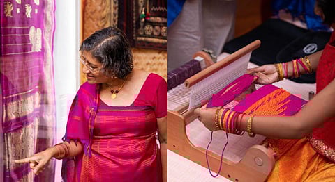 During their time at the weavers’ villages, sometimes Pavithra has had to improvise and find ways to change the more conservative mentalities of the people there. One of the stories that stood out was about how they needed a particular thread for the textile they were creating and the only one available to them in the locale was the thread used to religious rites. While the weavers were all skeptical to use it doubting its effectiveness in weaving and wondering about the religious aspects of it, Pavithra showed them that it is just another thread, capable of being woven into beautiful fabrics.