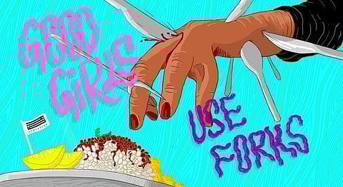But all these stories are ones away from India, so where’s the relevance you ask? Drifting back to home ground, we hear a tale of a young girl who felt the same joyful abandon as I did when she would eat with her hands. A junglee at heart and hand, Mandovi Menon had no reason to shrink away from the fact that her hands were her preferred choice when it came to feeding herself. “Just don’t be so messy,” her mother would request, and to the best of her ability - she tried. One of her reasons for having friends in school was so that she could go to their homes and eat their food. At one such friend’s house, she took her place at the dining table ready to get elbow deep into the food she’d been only too eager for. Only then did she notice 3 types of forks guarding the left of her plate, 3 kinds of knifes on the right and the front wall of the plate blocked by two spoons - an army of cutlery. A six course Indian meal followed, each course brought in and served to every person on the table - the gallant cutlery bustling to life all around her. Needless to say, she didn’t eat very much that night, and most definitely not with her hands.
