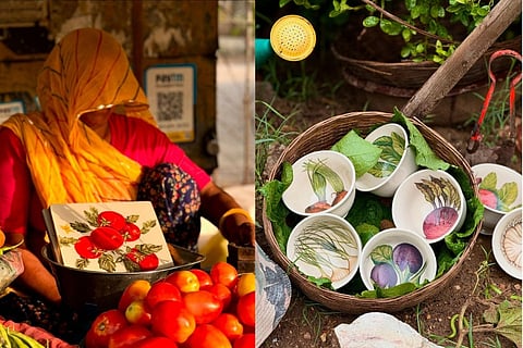 Khanoom ceramics are made using Kaolin clay sourced from Bikaner and pottered and painted by local artisans at their studio in Jaipur. This process melds traditional Indian techniques with contemporary-style dishware, bringing about the best of both worlds. Their designs also encompass this transient yet Indian-cultural feeling; for instance, their botanical-themed tea sets highlight the aforementioned citrus fruits, marigolds, lotuses, blue hibiscus, and more classically Indian flora. They also have dinner sets with medieval-inspired and astrology-themed artworks available now.