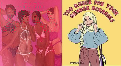 Arzoo exemplifies the desi Indian girl exploring her queerness through witty and quirky comic- like illustrations. Her queer pieces include comics on bisexuality, the haze of conforming to the gender binary and desi queerness. Arzoo also extensively illustrates about body positivity, mental well-being, and body acceptance.