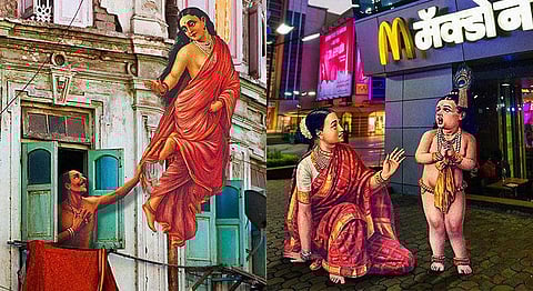 Around Ravi Varma’s time, lithographic printing was gaining popularity in many European countries and in the United States. Based on its worldwide acceptance, the then Dewan of Travancore, T. Madhava Rao suggested Varma and his brother to come up with a press of their own. Intrigued by this new idea, Ravi Varma first started a press in Bombay and later shifted it to a place near Lonavala. The press came up with tons of oleographs, depicting Hindu gods and goddesses. Back then, the press was the largest and most advanced in the whole of India. This series is looking at how it would be if the characters from Ravi Varma’s lived in Bombay and their interaction with the city.