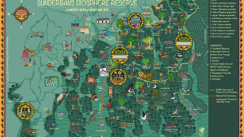 The creation of this map was commissioned by the Wildlife Trust of India (WTI) and currently graces the Sundarbans' mangrove interpretation center at Sajnekhali. Mr. Samrat Paul of WTI provided invaluable insights to Chakravarty during his field visit to the Sundarbans and that played an instrumental role in bringing this illustration to fruition. Sundarbans is an ecological gem at the brink of disappearance in the near future if we do not up the ante, in terms of conservation efforts. One can only hope that Chakravarty’s artwork continues to serve as a map and does not become a piece of archival history for future generations.