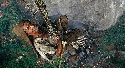 Prior to the hunt, the trail to the cliff is cleared out or repaired — a task undertaken by the entire community. Equipment is checked or remade if need be and the rope ladder is soaked in water so the flames are unable to damage it. The main hunter climbs the ladder and gets into position. In the documentary, one observes a very peculiar behaviour (called defence waves) that the bees adopt when they sense a potential threat — they raise their wings and create a wave around the hive as an alarm signal. In the film, we see the hunter stay still for several minutes, which is said to calm the bees and reduce their aggression. Long bamboo ‘tangos’ are then used, one to cut the honeycomb and another attached to a basket for the collection of honey. A third of the hive is left to repopulate for the next season of honey gathering. When the bundles of leaves are lit, the bees see the smoke as a sign of fire and become distracted. As their survival instinct kicks in, the bigger threat — the fire, needs to be eliminated first and the hunters’ presence becomes secondary.