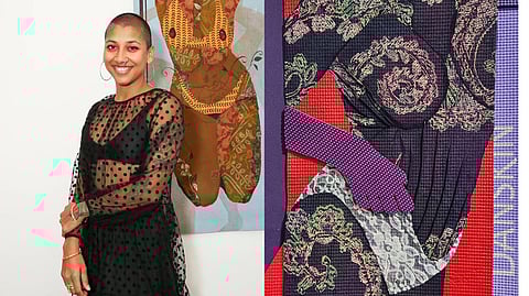 I started collecting and working with my mom's old sarees and salwar kameez when I was an undergraduate 15 years ago. These fabrics are from a certain time; from the 80s and 90s. The sarees are from her generation and sometimes I'm also using my old salwar kameez and Indian outfits that I don't wear. These fabrics have value, like when we say, “It's from India: it's good cotton. Get it.” These are signifiers of trade, exchange, and commerce between cultures around the globe. The bodies in the paintings are enmeshed with these textiles that are of family lineage and matrilineal lineage. There's a lot of personal touches that I think bring humanity to the pieces. Clothes and fabrics are on bodies and that carries a certain energy. So do the yoga mats that have been used in someone’s practice; they carry their energy and sweat. Putting all these human touches and traces of humanity together all kind of goes against the machine of capitalism that erases all that.