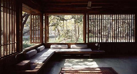 The inclusion of water in more than one unique way - the well, the pool beyond the house, and the stream is one more feature that makes this house so covetable. Lastly, the layering of light through several distinct materials is perfect for differing degrees of privacy. This is executed with screening devices made of fine netting framed in crafted wood, sliding and folding wooden windows among other similar features.