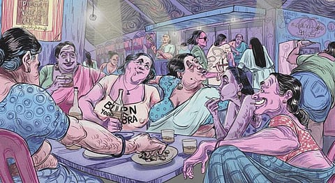 Envisioned while observing women every day in the ladies compartment of Mumbai locals, her artwork portrays a wild fantasy involving ordinary Kerala women who live on the lines of what an ‘ideal women’ is (otherwise known as ‘kulastree sankalpam’) as written by men.